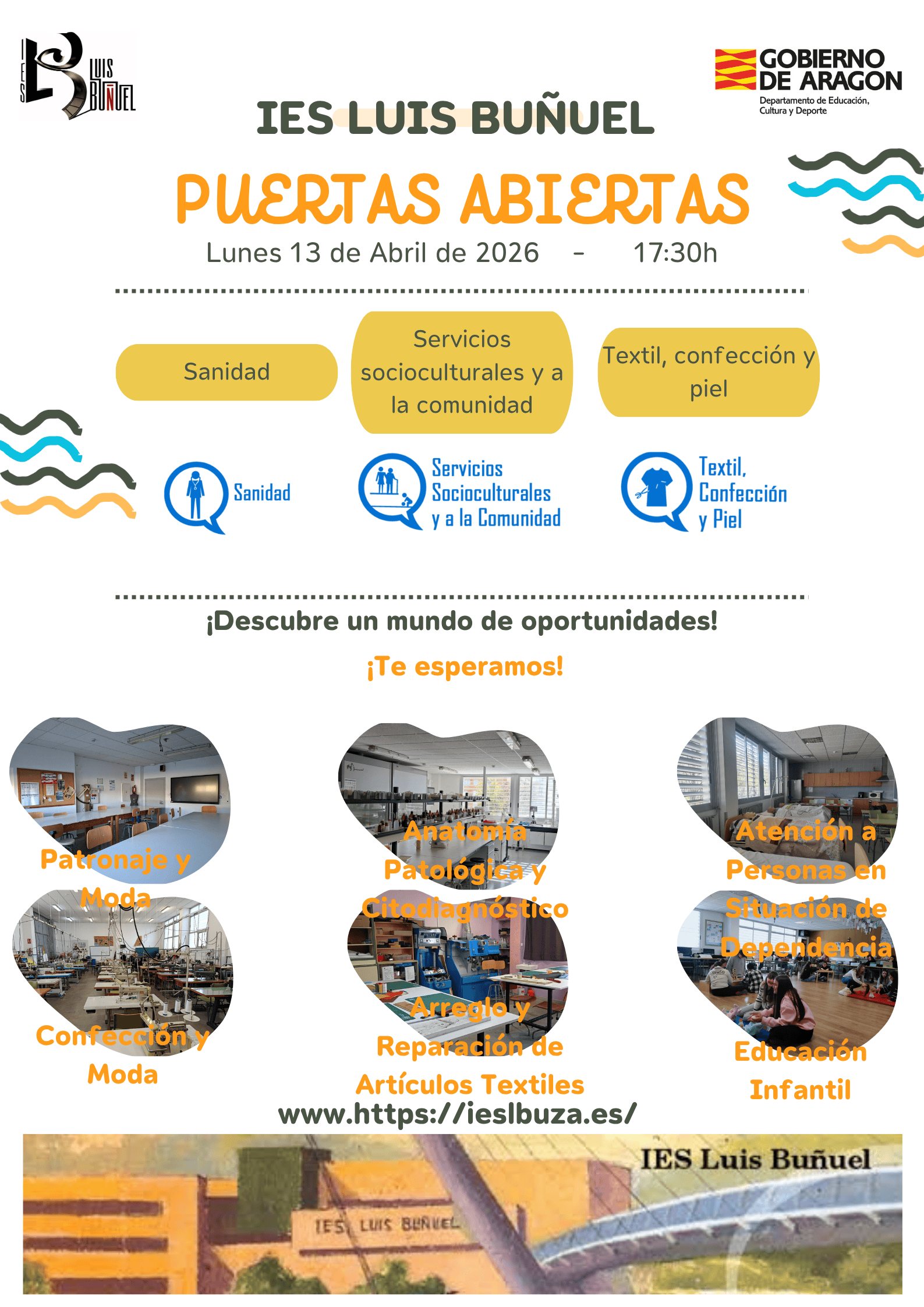 Si quieres conocer nuestra oferta formativa e información sobre el proceso de admisión pincha aquí: PRESENTACIÓN JORNADA DE PUERTAS ABIERTAS CICLOS FORMATIVOS 26_27 JORNADA DE PUERTAS ABIERTAS CICLOS FORMATIVOS 📅 Fecha: Lunes 13 de Abril de 2026 🕔 Hora: 17:30 h 📍 Lugar: IES Luis Buñuel Oferta formativa: 🧵 Familia Profesional: Textil, Confección y Piel⇓ CF de GB...